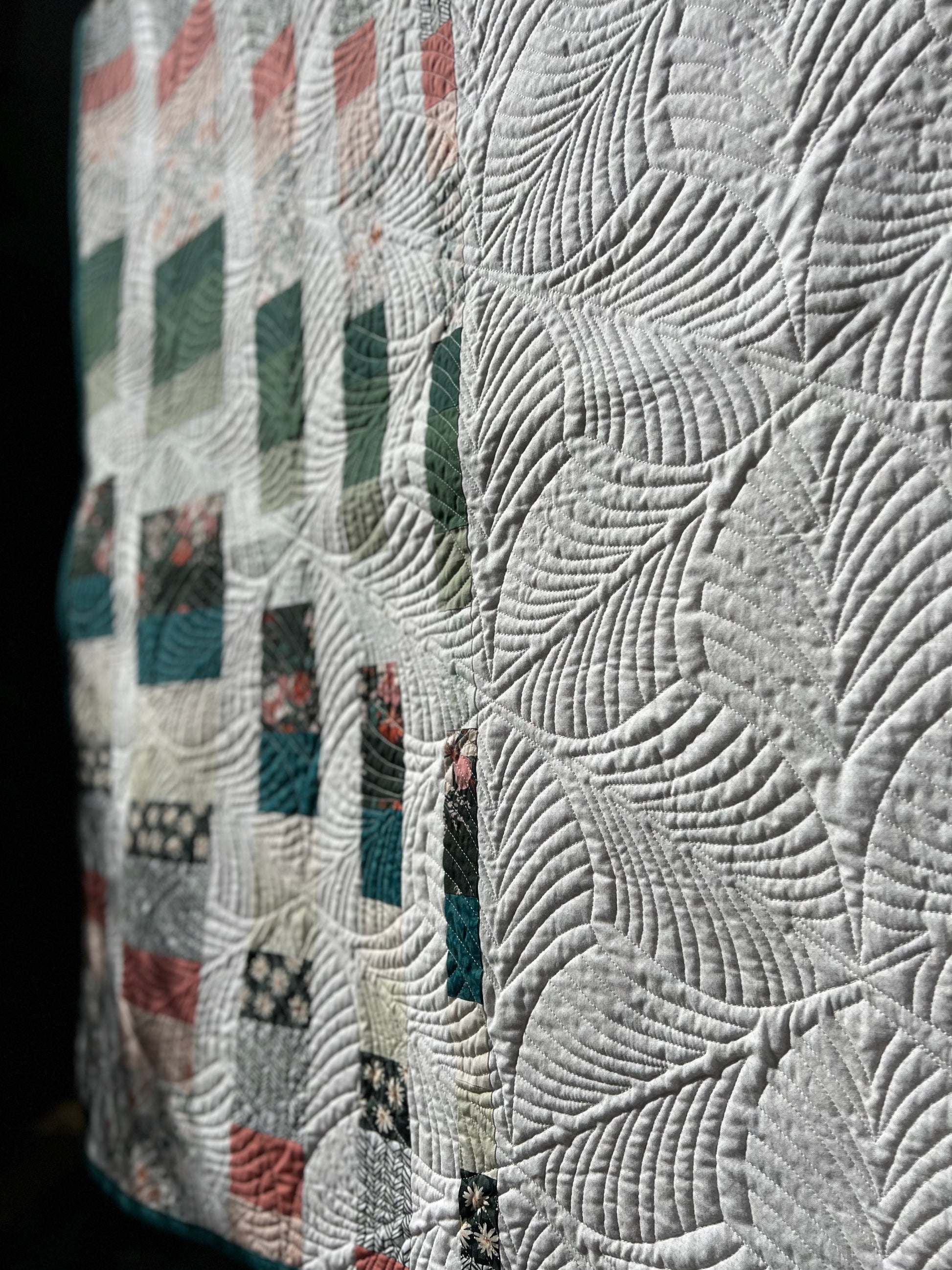 This is such a special quilt! I really wanted to showcase the beautiful fabric and the quilting, and it came together so well. This would be a perfect quilt to bring on travels to have a piece of home with you, or a wonderful large baby/child quilt. It's perfect for a toddler bed, or as an extra layer as your child grows. The quilting is so tactile and gorgeous and will just get better with washing. Fabric is 100% quilters cotton and batting is Hobb's 80/20 cotton/polyester.