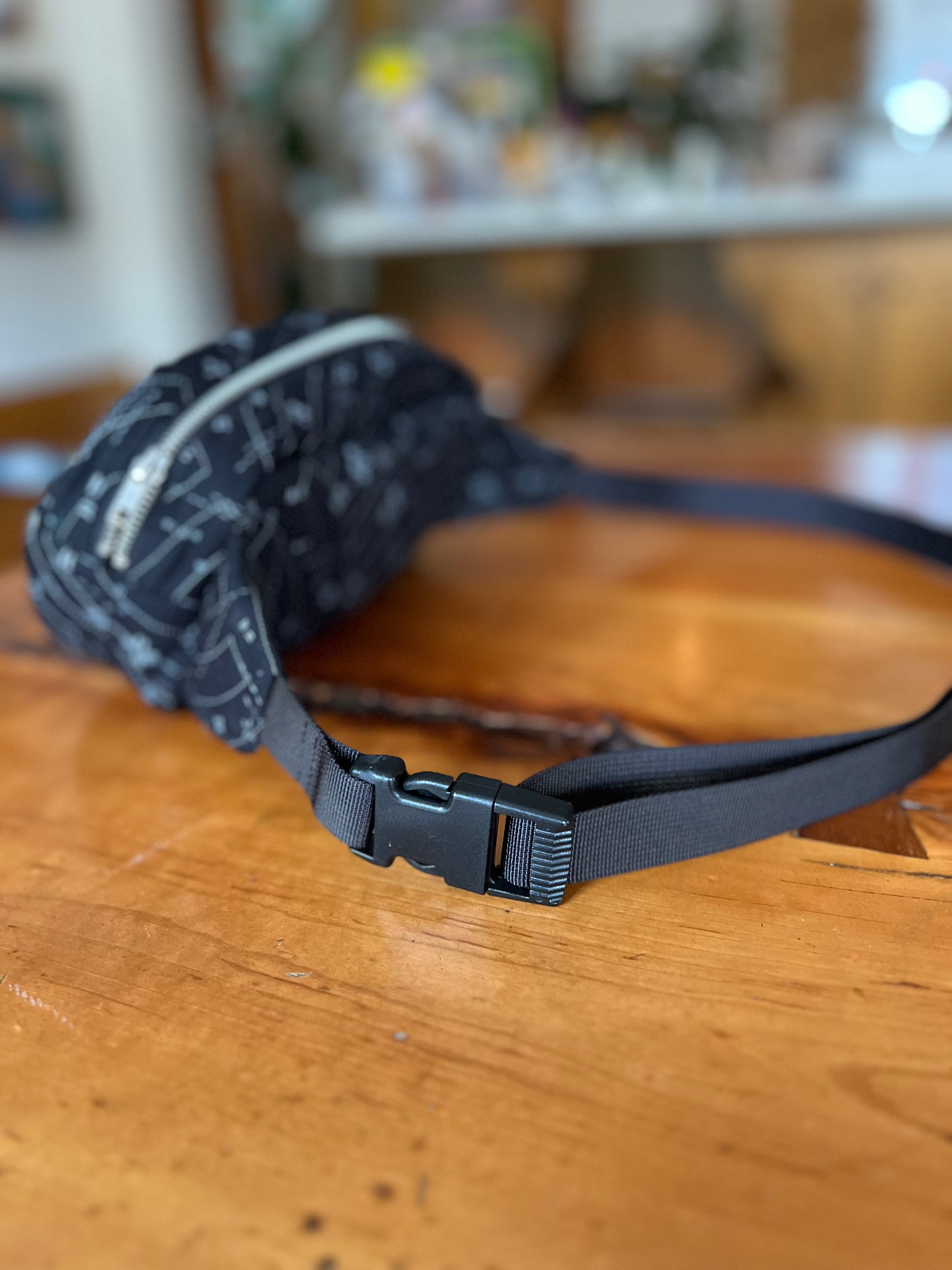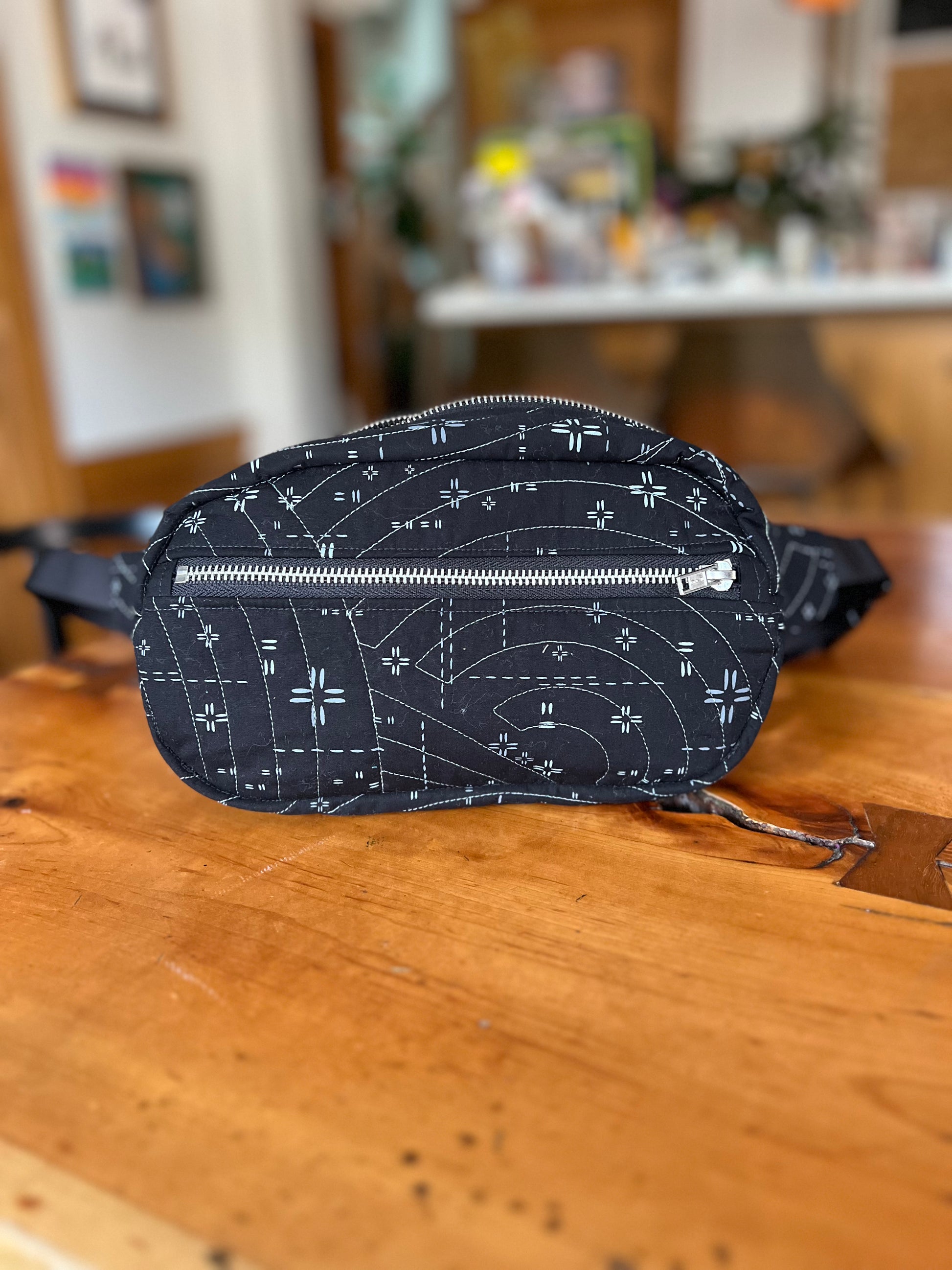This is a great everyday crossbody bag to hold all of your essentials. It's made of Quilter's cotton and cotton/poly batting, with two zipper pockets, 1" webbing and a plastic clasp/slider. The fabric was professionally longarm quilted and all are made in very small batches.