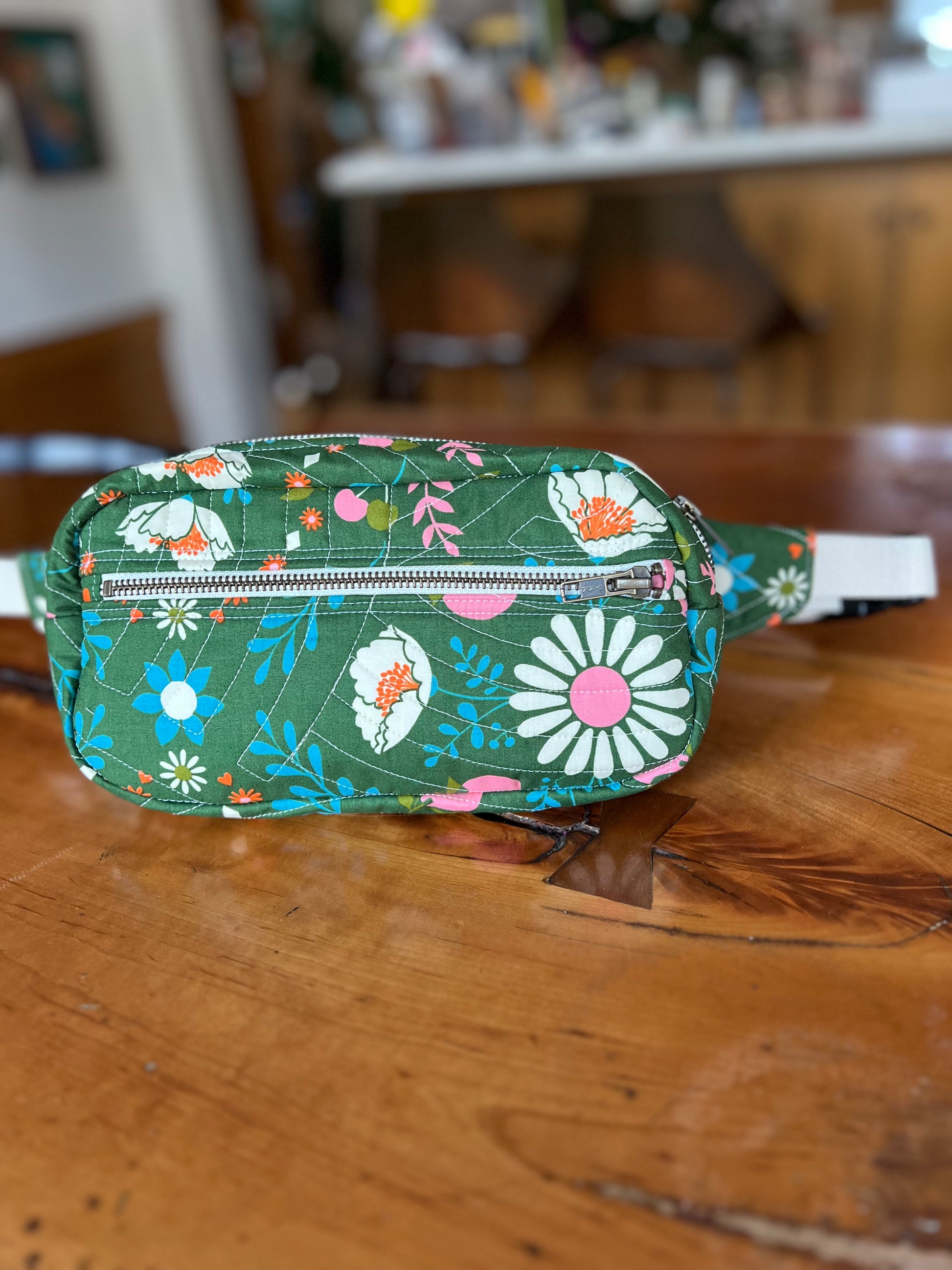 This is a great everyday crossbody bag to hold all of your essentials. It's made of Quilter's cotton and cotton/poly batting, with two zipper pockets, 1" webbing and a plastic clasp/slider. The fabric was professionally longarm quilted and all are made in very small batches.