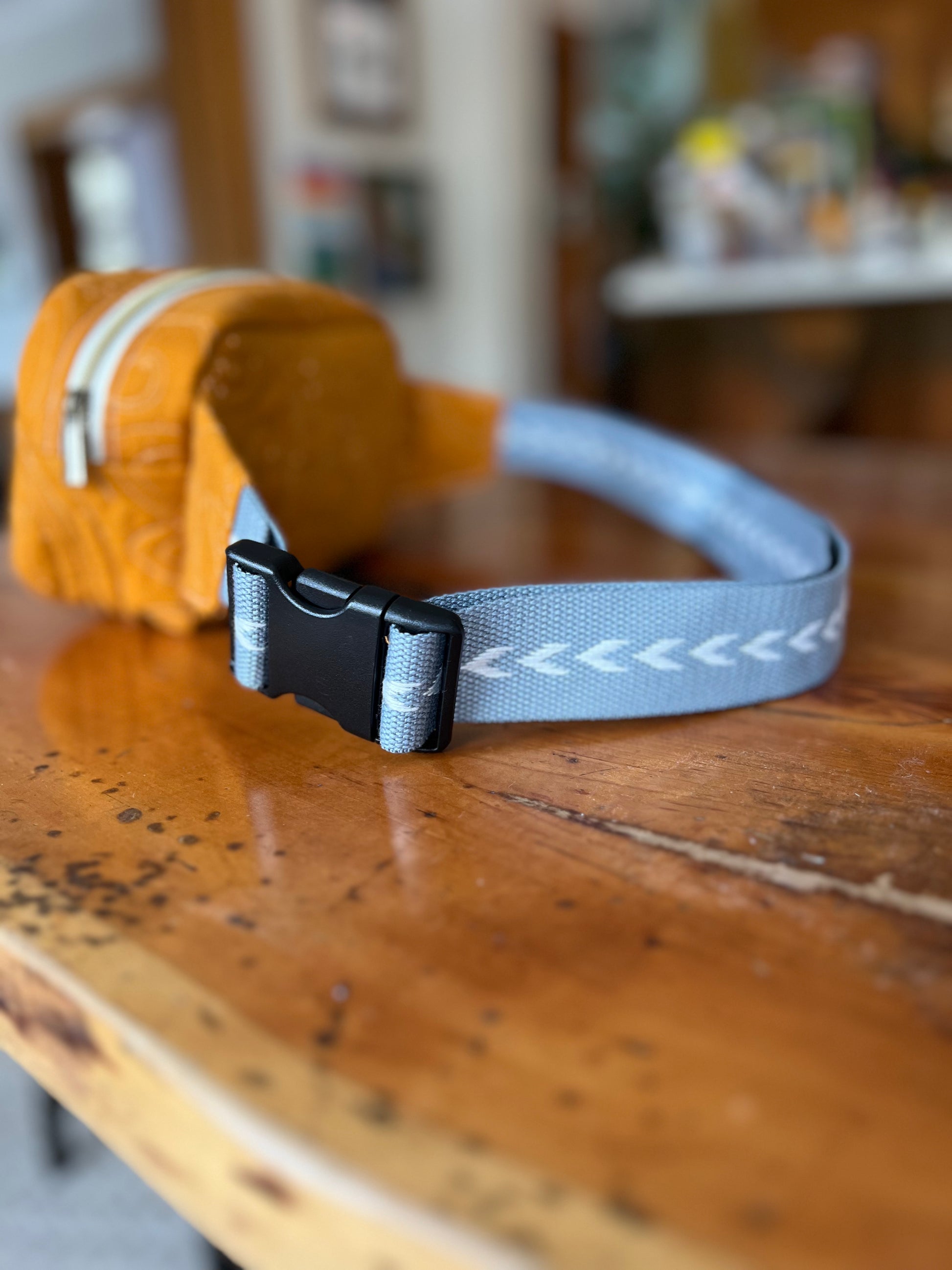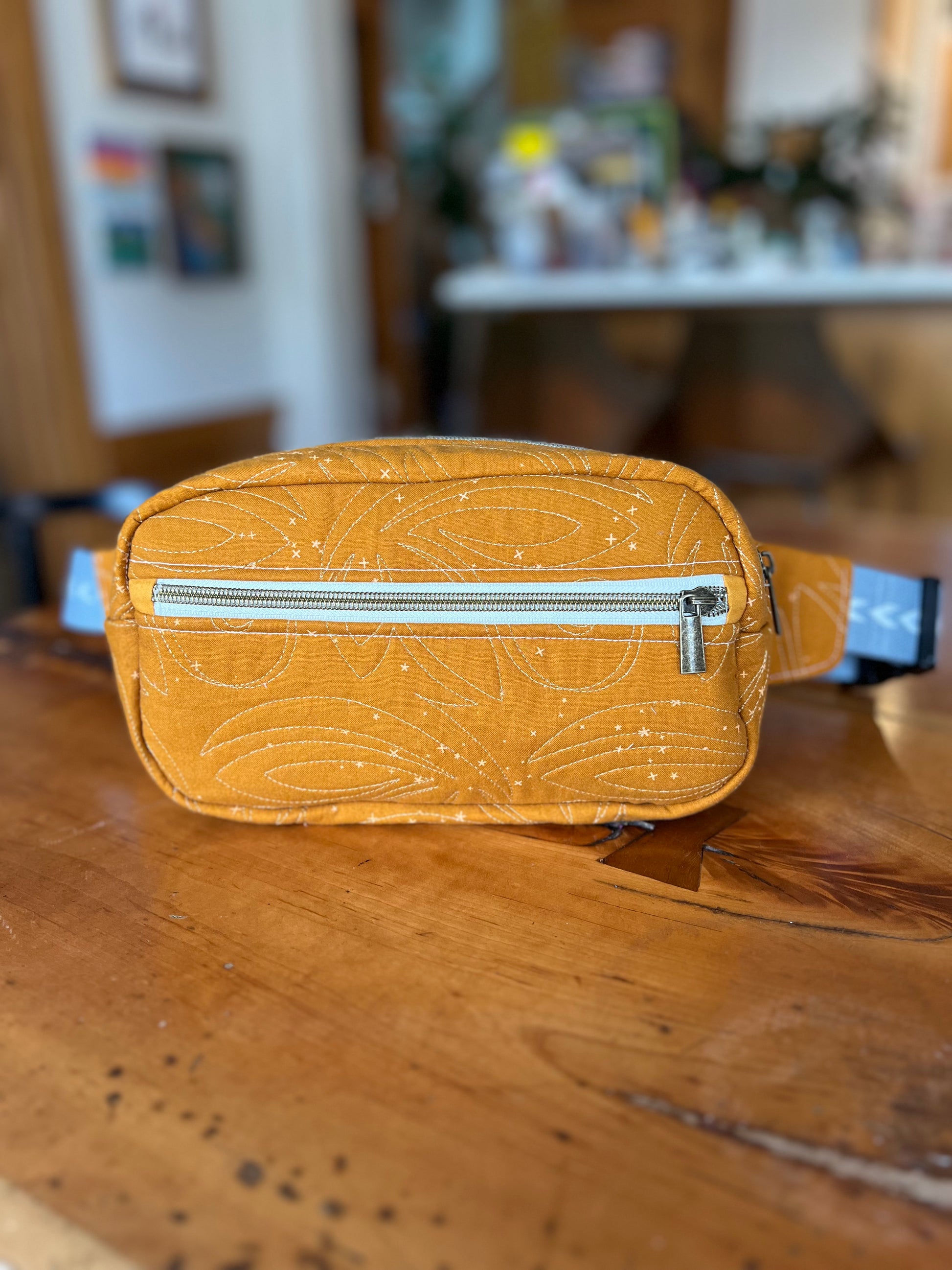 This is a great everyday crossbody bag to hold all of your essentials. It's made of Quilter's cotton and cotton/poly batting, with two zipper pockets, 1.5" webbing and a plastic clasp/slider. The fabric was professionally longarm quilted and all are made in very small batches.