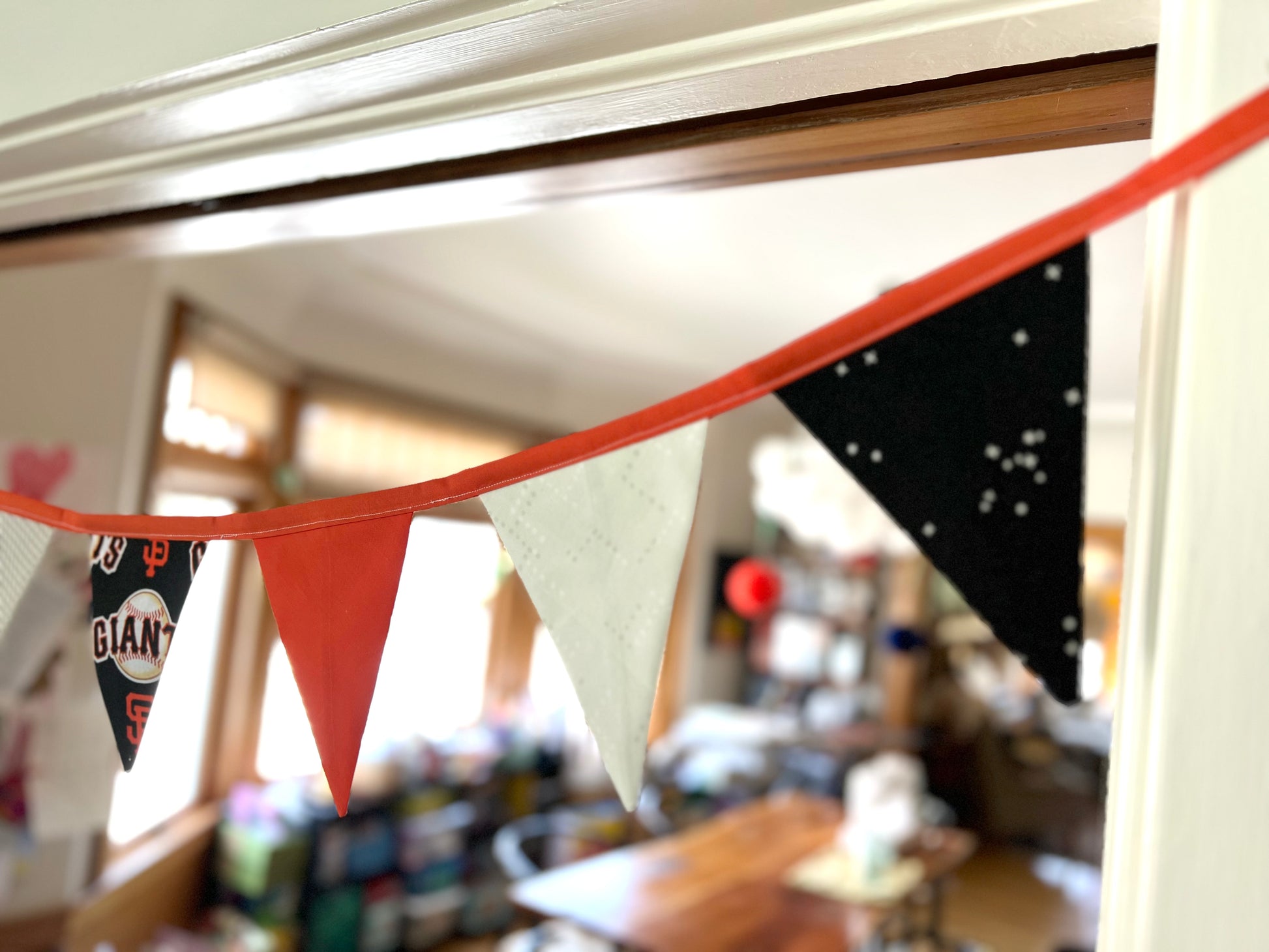 7.5 ft. fabric SF Giants bunting in various shades of orange, black and white. Fits a large doorway, or anywhere you may think to hang it. Reusable from season to season.