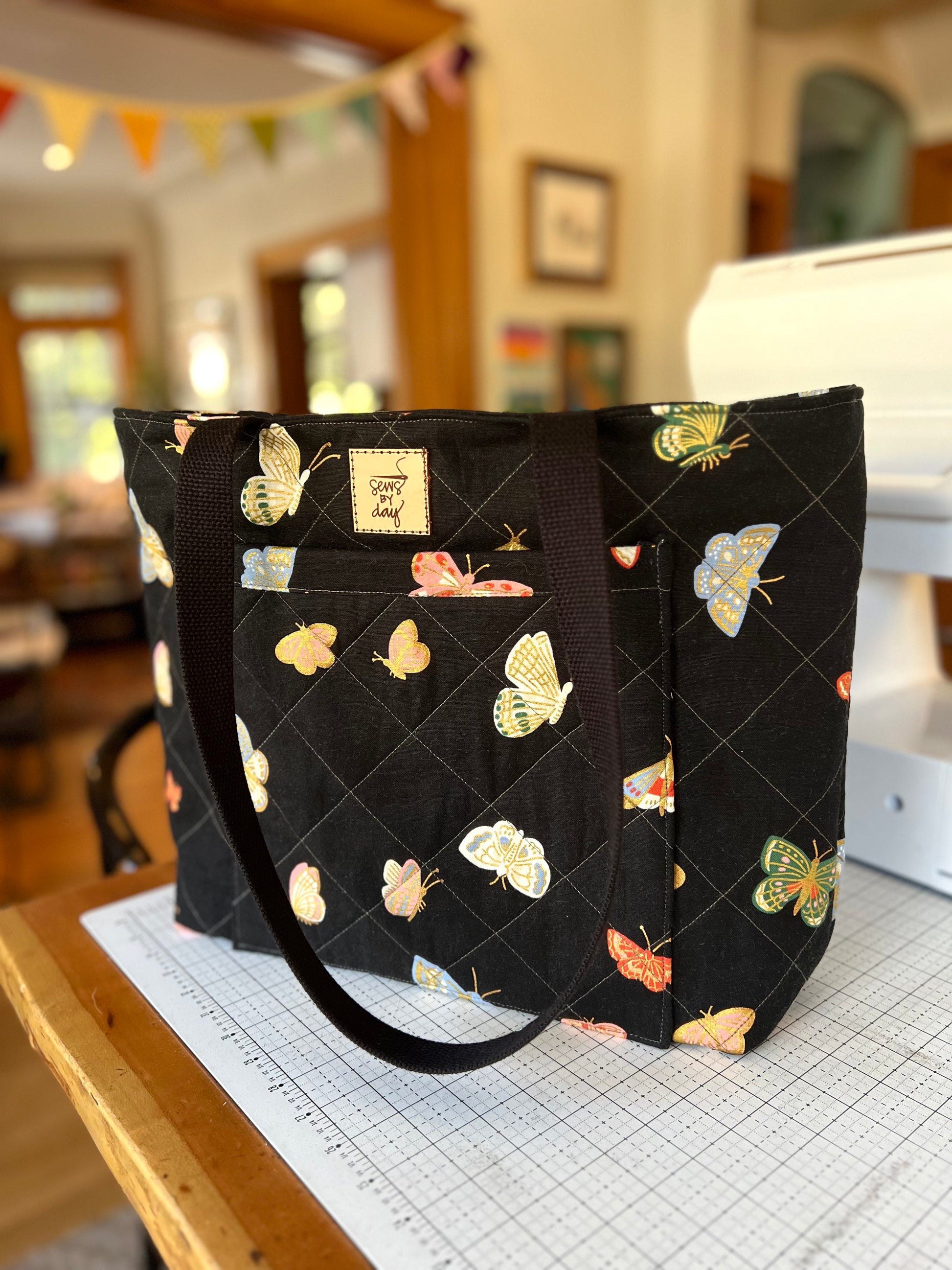 This is a great tote to use for literally anything. It fits so much and includes an exterior pocket with a magnetic snap, two interior slip pockets, a key leash and a zip top. The exterior is made of canvas, quilted with a layer of cotton/poly batting and the interior is the prettiest floral linen cotton blend. I machine quilted these myself and all are made in very small batches.