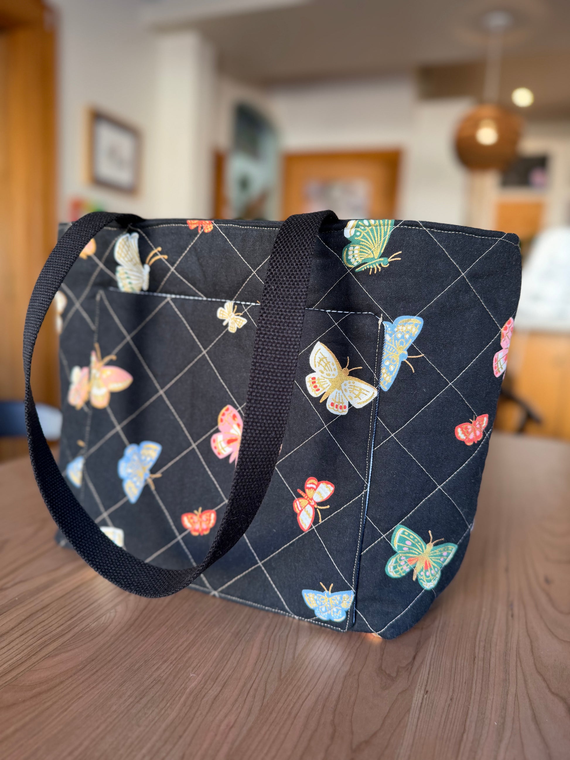 This is a great tote to use for literally anything. It fits so much and includes an exterior pocket with a magnetic snap, two interior slip pockets, a key leash and a zip top. The exterior is made of canvas, quilted with a layer of cotton/poly batting and the interior is a sturdy twill. I machine quilted these myself and all are made in very small batches.