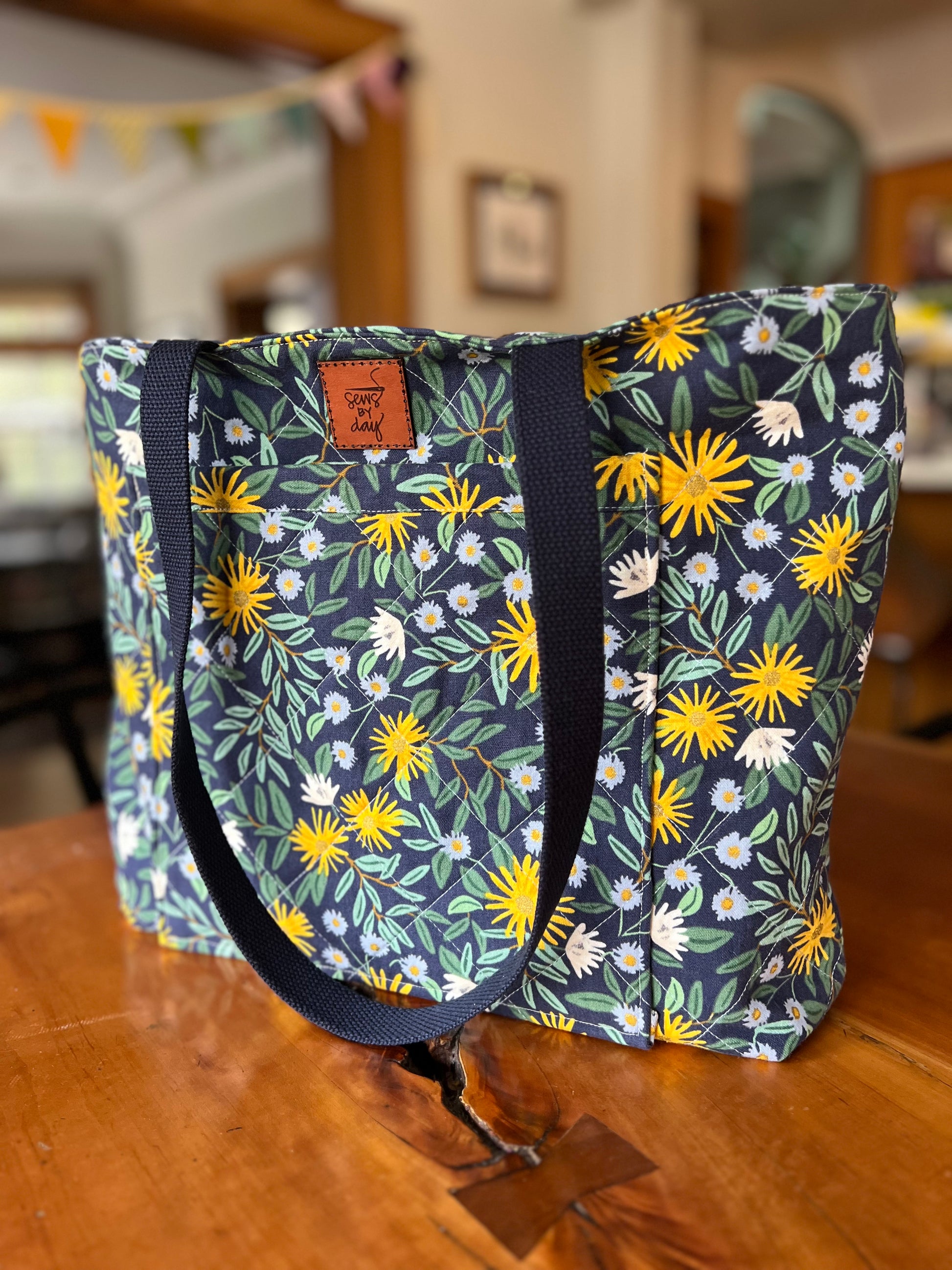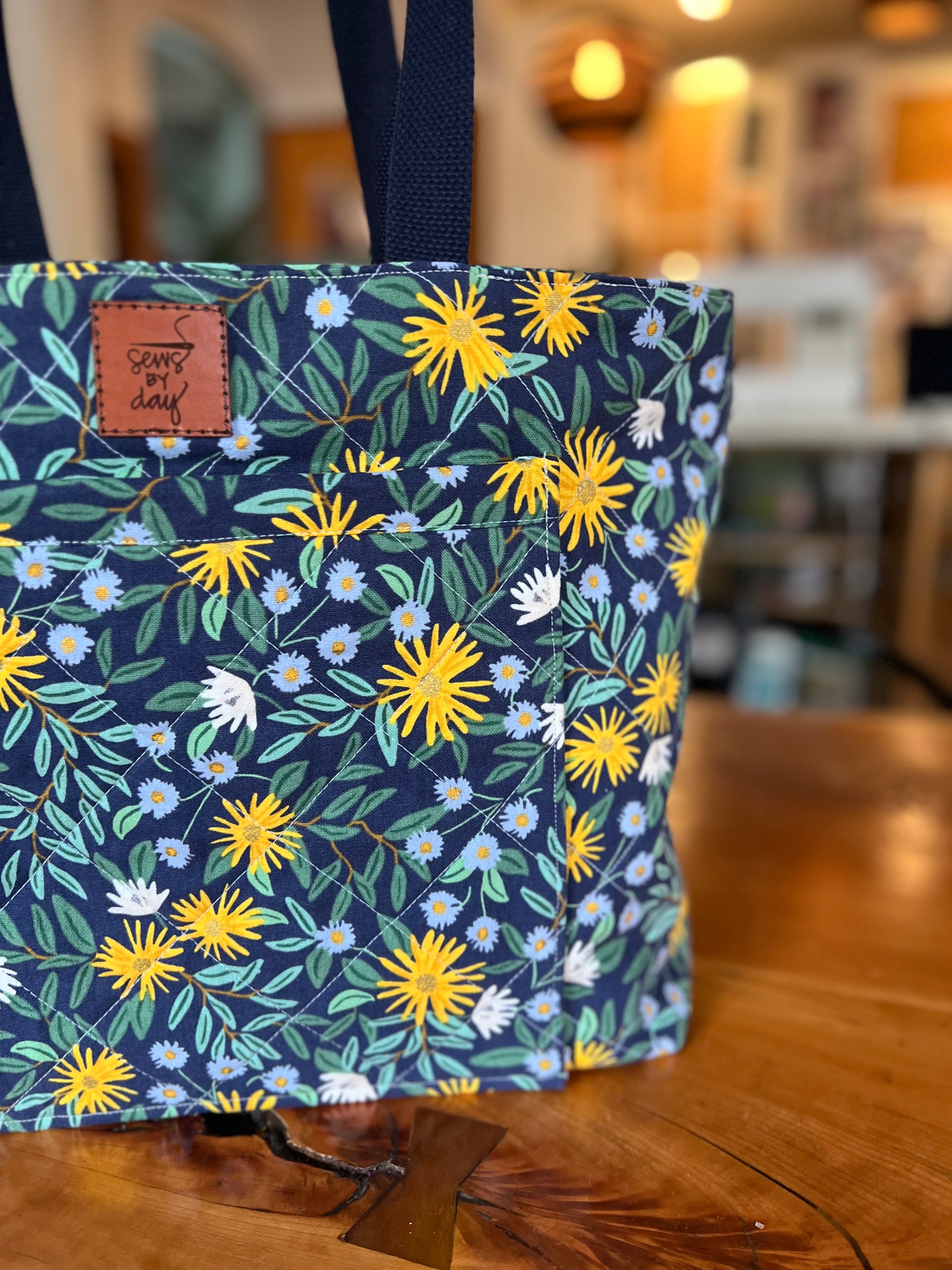 This is a great tote to use for literally anything. It fits so much and includes an exterior pocket with a magnetic snap, two interior slip pockets, a key leash and a zip top. The exterior is made of canvas, quilted with a layer of cotton/poly batting and the interior is a sturdy twill. I machine quilted these myself and all are made in very small batches.